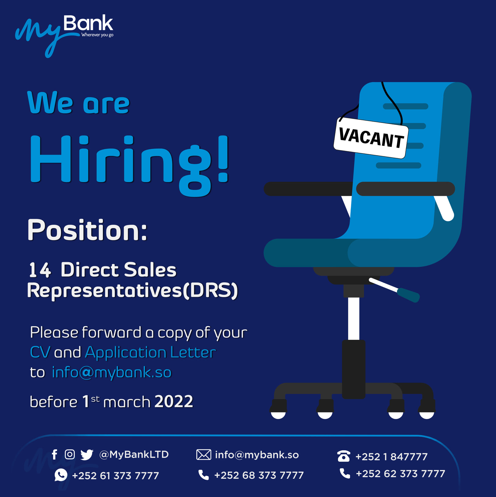 MyBank Limited waxa uu bulshada Soomaaliyeed ogeeysiinayaa inuu qaadan doono 14 qofood oo ah hoowl-wadeenadda iibka tooska ah “𝗗𝗶𝗿𝗲𝗰𝘁 𝗦𝗮𝗹𝗲𝘀 𝗥𝗲𝗽𝗿𝗲𝘀𝗲𝗻𝘁𝗮𝘁𝗶𝘃𝗲𝘀” kuwaas oo lagu qiimeeyn doono wax soo saarkooda. Hoowl-wadeennadan waxeey ka hoowl gali doonaan xaruumaheenna MUQDISHO.